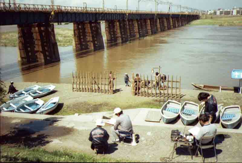 仮橋もかけられている。網(投網?)を川の瀬に仕掛ける姿もあり、その横にはこれから網を投げる人が描かれている。